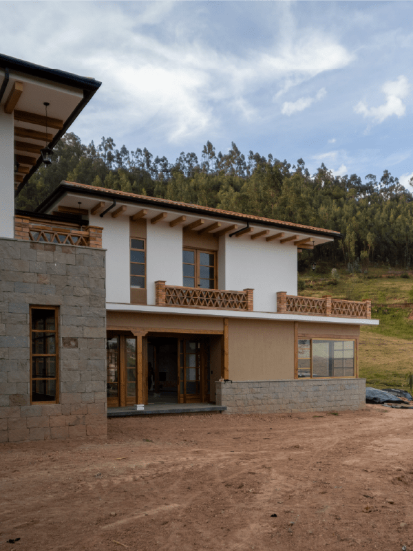 La casa está construida con estructura de hormigón armado, columnas de madera y hierro recubiertas, paredes de ladrillo con revestimientos de piedra de chuquipata instaladas de forma tradicional con junta perdida.